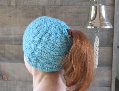 This fun hat is an easy project for a beginner or a fast knit for someone more experienced. The basketweave pattern uses only knit and purl stitches and it is knit flat in one piece. It takes only 100-125 yards of worsted weight yarn. The button band allows you to wear your ponytail high, low, or in between - just undo the button corresponding to the position of your ponytail. For a messy bun, undo two buttons. Easy!