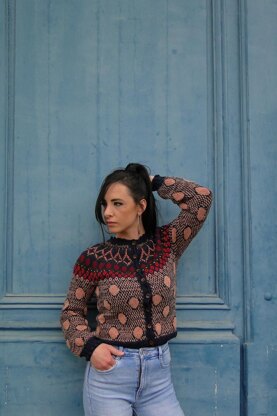 Starting with a bobble-edged neckline, Batignolles can be made as a cardigan or a sweater and is knitted from the top down with increases to shape the shoulders. The yoke is then separated to work the sleeves and body in their bold polka-dots, all using the stranded colourwork (Fair Isle) technique. The sleeves are generous to give a gathered blouse-effect, tightened at the cuff and finished off, once again, with a row of small bobbles. The body is straight and can be lengthened or cropped to your preference.