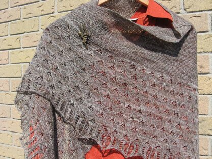 This crescent shaped, beaded shawl features a unique beaded design for the scales and wing-tips. The textured shoulders of the Battle-Weary Dragon are scarred and the wing-tips are tattered.