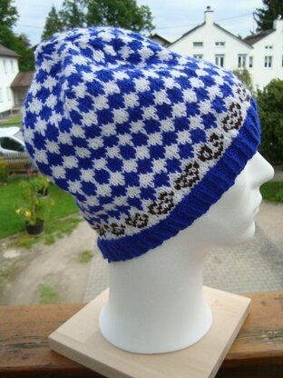The beanie has a one color ribbing, followed by a pretzel border pattern and the Bavarian pattern in blue and white.