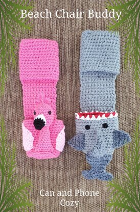 Get ready for summer with this unique Beach Chair Buddy. Beach Chair buddy attaches to your chair and will hold your can or bottle of water. On the opposite side is a pocket for your suntan oil or phone. My husband and I often go to the beach and end up with our phone in the sand and the bottom of our cans dirty, so I created these out of necessity. They would also work on any chair with a handle. Pattern includes both the Flamingo and Shark patterns and is a written step by step tutorial with pictures. Makes up quickly using a double strand of worsted weight yarn and is quite sturdy.