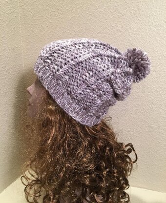 This hat is knit on the purple Knifty Knitter adult hat loom (5/8" gauge with 48 pegs) and uses approximately 120 yards of a super bulky yarn. The discontinued Red Heart Zoomy yarn in the Malted colorway was used in the sample. Lion Brand Hometown USA would be a good substitute.