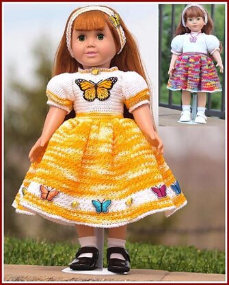 Becca Loves Butterflies, and she also loves her new butterfly-bright, summery party dresses! This pattern set includes two versions of the dress: the short version in bright ombre colors, with its matching butterfly necklace, and the longer version in "Monarch" colors of shaded yellows, decorated with ribbon roses and embroidered butterfly appliques.