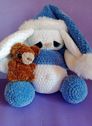 330 yards of size 6 yarn in primary colour (white) 180 yards of size 6 yarn in secondary colour (blue) 60 yards of size 6 fluffy yarn or chenille tertiary colour (white) 100 yards of size 6 yarn in brown for Babbu’s Bear 30 yards of size 6 yarn in beige for Babbu’s Bear 30mm safety eyes for Babbu, 14mm eyes for the bear 4mm hook Optional: Pom Pom for sleep hat Scissors Recycled yarn stuffing (polyfill will work) Embroidery thread for detailing if you want additional details. Darning needle, stitch marker, row counter (or a way to keep count of how many rounds you’ve done) Your Babbu will be about 50-60cm long depending on tension. His Danna Bear accessory will be about 15cm.