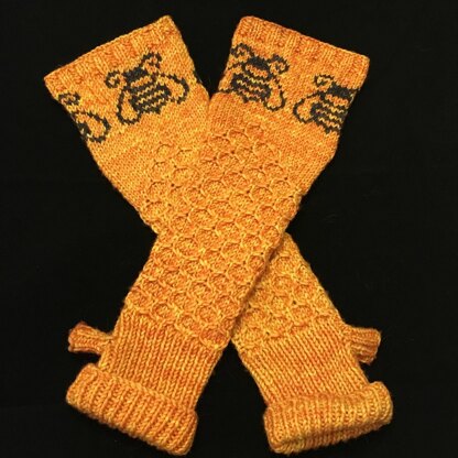 You’ll start with 1x1 ribbing, then work ‘repeating circle’ cables for a bit, and on to the colorwork bees after a short bit of stockinette, ending with 2x1 ribbed upper cuff. and finishing off with the afterthought thumb.