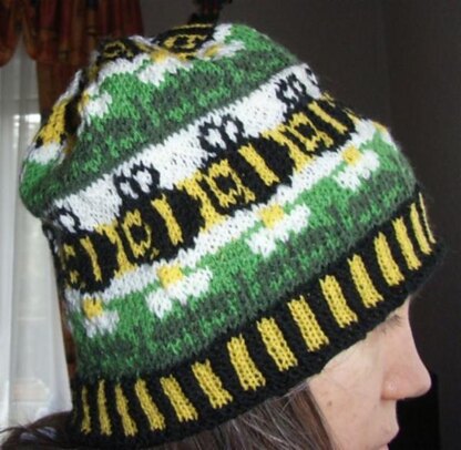 Then follows the meadow with the daisies above fly the bees. Both bands are on the beanie twice. And at the top is a lovely little daisy flower.
