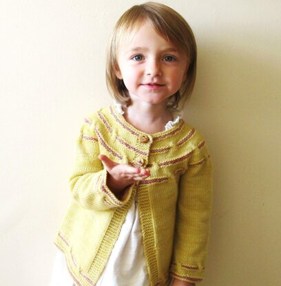 This sweet Childs’ cardigan is worked from the top down in one piece. The sleeves are worked in the round.