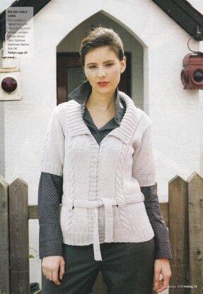 This is a pattern for a Belted Cable Cardigan, originally published in Knitting magazine. It is in stocking stitch with a single simple cable panel, rib edges and collar, and a rib belt. The yarn is now discontinued. Any yarn knitting to this standard dk tension can be used