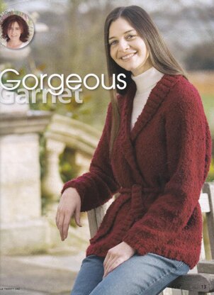This is a pattern for a Belted Shawl Collar Jacket, originally published in Knit Today issue 21. It is a simple shape in reverse stocking stitch with rib edges and a rib shawl collar and belt. The jacket is knitted in reverse stocking stitch because this works better with a boucle yarn. If you are using a different yarn ie not boucle, it could be easily converted to stocking stitch. Photo Knit Today.