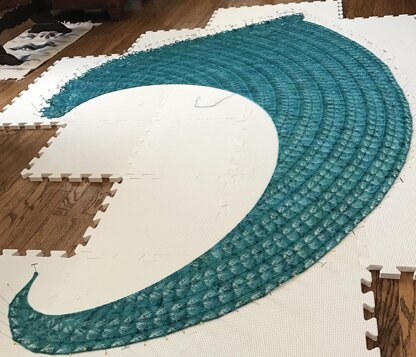 | One size only: | Outer edge of curve (cast on to last row): 92 in / 234 cm Top Edge: 47 in / 120 cm |