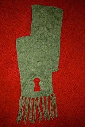 My scarf is a special Lock Pick Scarf with a keyhole in one end, a moss stitch wood effect around the keyhole, and thick ends to weave lock pick wires into for sneaky thieves.