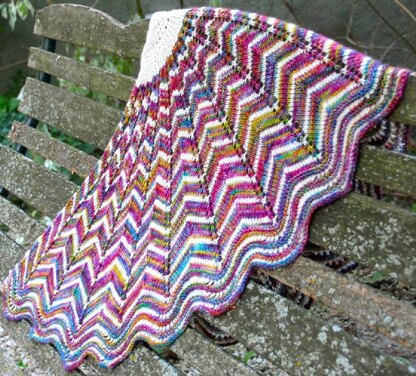 The Berkeley shawl combines three elementary lace techniques: a pi shawl beginning (meaning every time the radius of the knitting doubles, the stitch count doubles), followed by chevrons, and ending in feather and fan lace. This pattern is suitable for an advanced beginner. It includes both complete written directions, and an extensive chart.