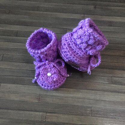 BETH CROCHET BABY BOOTIES PATTERN PDF - Pretty puff stitch booties in 4 sizes from Prem to 6-12 Months altered by hook size. Made seamless from bottom up so no sewing of side seams.