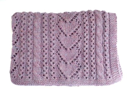 This pretty cable and heart baby blanket is worked in an Aran wool so it grows really fast. It uses basic lace and cable patterns edged in a garter border making it a perfect project for an introduction to cables for a beginner or an easier project for a more experienced knitter. This pattern is easily customisable for use as a lap blanket or throw.