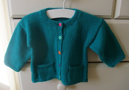 I designed this fun cardigan for the grandaughter of one of my lovely customers ... A gorgeous bright colour for summer days or to cheer up a winter one ... Add mismatched buttons for individuality or have them all the same ... Knit on 2 needles and seamed with inset pockets to hold little treasures ...