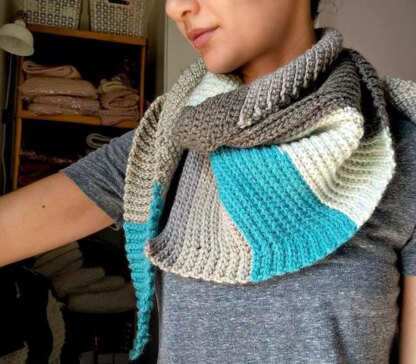 This pattern creates an adjustable sized shawl on the bias and is designed for those worsted weight, chunky self-striping yarn cakes like Caron Cakes. It can be created with just one skein!