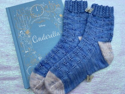 They begin with the ribbing that reflects the two different lives of Cinderella. Travelling down the leg and foot of the sock are butterflies, just like the ones on Cinderella's stunning ballgown. The French Heel represents the trip her father took, and the gift that he brought her back. Finally, the Cottage Toe signifies the beautiful home where she grew up.