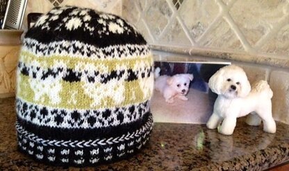 It resembles the Westie beanie. It has a dotted ribbing with a herringbone edge, paws and bichon frise dogs all around and another round of paw prints at the top.