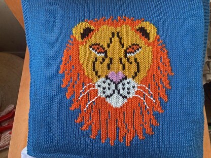 The Lion motif was added using Swiss Darning/ duplicate stitch from the chart after the background had been knitted. The, optional, whiskers were added using back stitch. You could add the motif using the intarsia method from the chart as you knit.