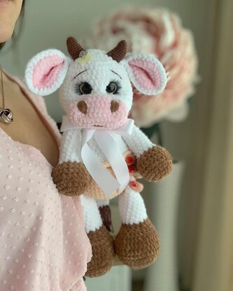 Required materials: • 1.5 skeins of white color plush yarn I used Himalaya Dolphin baby #80301 • 0.5 skein of brown color plush yarn I used Yarnart Dolce yarn #765 • A little of pink color plush yarn for muzzle and ears. I used Himalaya Dolphin baby #80303 • A little of peach color plush yarn for cow’s nappy. I used Himalaya Dolphin baby#80333 • A little any cotton brown color yarn for horns. I used Alize Cotton Gold #493 • 4mm crochet hook for toy and 2mm for horn • safety eyes 20mm • eyelashes + transparent glue-gel • soft stuffing • thin long needle and needle with a large eyelet • marker • yarn cutter or sharp scissors