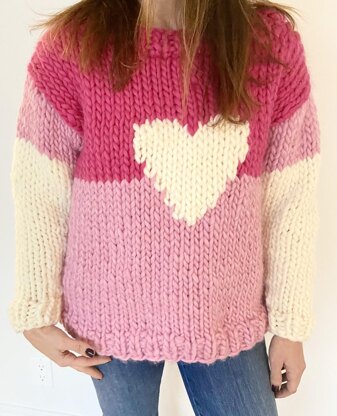 I feel the LOVE! This sweater is warm, cozy and happy on so may levels. It is a fun quick knit on big needles with a bulky weight yarn.