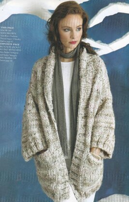 This is a pattern for a Big Jacket, originally published in Knitting magazine. The yarn has now been discontinued. Any yarn knitting to the tension 9/12 can be used. Rico Creative Twist Super Chunky knits to the tension on the same needle size. This is a very simple garment fine for beginners. It has two pockets. Photos Laurel Guilfoyle for Knitting magazine.