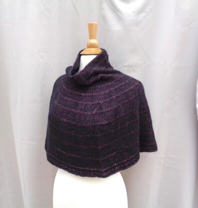 A comfortable poncho capelet with a cowl neck and drop stitch details. The unique yarn has the softness of alpaca with a jewel-like shimmer that accentuates the gradually spaced drop stitch rows.