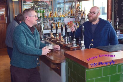 This cosy cardigan is top down construction, the sleeves are joined as you go as is the colar. With a shawl collar this cardigan is a must for the man about town The model in blue is 6ft and a size XXL The model in gren is 5ft 10” and a size M