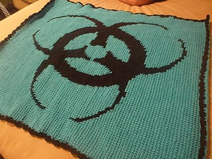 The biohazard symbol is given as a colorwork chart. The accompany instructions are for a baby blanket using the yarn and gauge shown, using tunisian crochet stitches, however... don't feel limited to that!