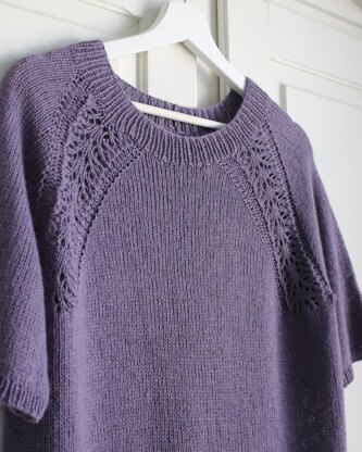 The tee is knitted top down seamlessly. The neck part is worked flat, using German Short Rows method for shaping the back neck part. After that the design is knitted in rounds. The raglan lines at the yoke are knitted with a beautiful and easy to knit Lace Leaf pattern. All other parts are knitted in simple and plane Stockinette Stitch to create a texture contrast. After dividing the garment in body and sleeve it is continued in Stockinette Stitch. All edges are knitted with 1x1 ribbing.