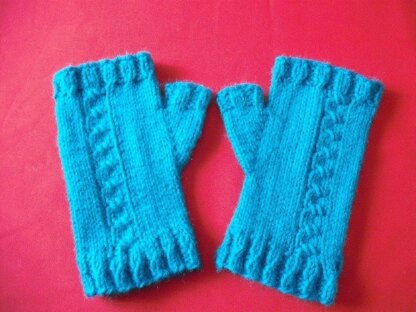 These fingerless gloves have a flared cuff and a mock cable design on the front of the glove. The thumb gusset is well constructed. These gloves are roomy and comfortable.
