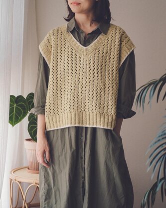 Yarn: De Rerum Natura, Robinson, 70% Merino, 30% Cotton, 250m/270yd per 100g MC: Citronnade, 2.5 ( 2.8, 3 )( 3.5, 4, 4.5 ) Balls. Approx. 625 ( 700, 750 )( 875, 1000, 1125 ) m / 684 ( 765, 820 )( 957, 1094, 1230 )yds CC: Sucre Glace, Approx. 50 ( 70, 90 )( 110, 130, 150 ) m / 55 ( 77, 98 )( 120, 142, 164 )yards (You may need more yardage of MC yarnwhen extending the length of body)