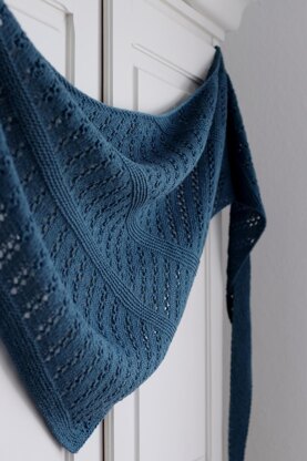 The shawl is knitted flat beginning from one corner to the opposite side. The inclined triangular shape is created by increasing and decreasing the stitches. Slipped edge stitches give the shawl a nice slick finish.