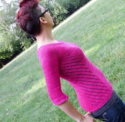 Blind Date is a fitted pullover mostly worked in the round from the top down, with narrow elbow sleeves. The pullover features an easy lace motif on the sides, dramatic waist shaping and lace ruffles for the sleeve edging. Knit it in a bold colour for an eye-catching result!