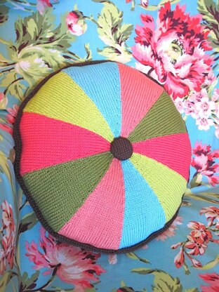 This beautiful and colorful pillow is constructed by making individual triangles which are then seamed together. The two sides of the pillow are then joined by an attached I-cord bind-off after stuffing with batting. Two covered buttons are then attached at the center.