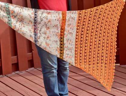 A true bliss to crochet, this shawl is based on the asymmetrical triangle construction and is worked so that one side always grows straight and the other grows on the bias. The basic double crochet fabric is broken up by bands of the bliss lace pattern in contrasting yarn, that makes for a very interesting project. Finally once the main yarn is finished, we switch to an entire panel of the lace with a contrasting yarn.