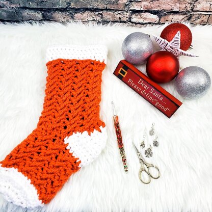 The sample shown is - Bernat Softee Chunky Weight #6 – 100% Acrylic with 2 balls – I used 2 different colors for the Stocking made in Bernat Softee – Color White & Color Pumpkin. Full ball of Pumpkin used & 58g of White left over – approx 145 yards needed total if using one color = 2 balls needed