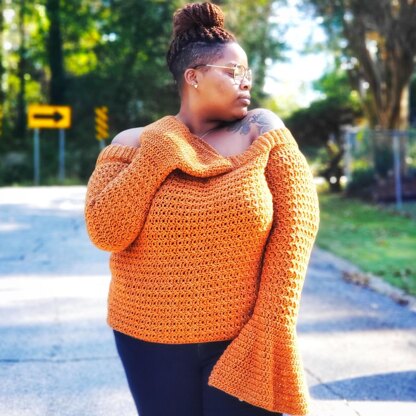 This off the shoulder sweater is the perfect addition to your wardrobe. Dramatic bell sleeves gives a sexy 70’s feel that is sure to make anyone feel a little sassy.