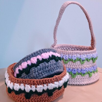 This is a choose your own adventure style pattern. It features the link stitch, hdc clusters, puff stitch and tunisian simple stitch. The leaves and flowers are worked into the front and top of the link stitch, giving the basket some great texture and intrigue.