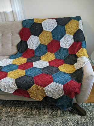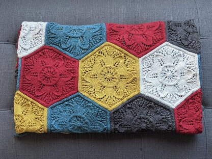 Blooming Hexagons is made up of individually knit hexagons that feature a beautiful blooming flower motif that when seamed together create a stunning flower bouquet.