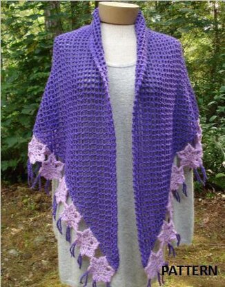 Crochet a triangle in an easy mesh pattern and add a fringe of perky flowers frolicking along the side edges.