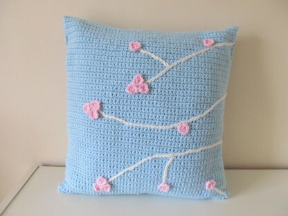 This beautiful cushion depicts pink spring blossom on bare branches against a blue sky. Made using surface crochet and sewing blossoms onto the main cushion, this design makes a pretty cushion which brings Spring indoors!
