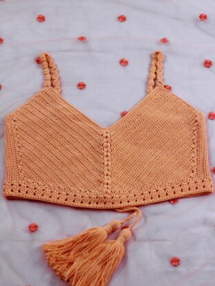 This elegant yet comfortable crop top pattern is made in peach colour cotton yarn. It is perfect for summer.