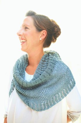 Ripples radiate from the calm centre of this semicircular lace shawl, the initial smooth-sailing stitches giving way to broken, stormy seas at the outer edge. Blue Bang is constructed from the centre out according to Fibonacci’s sequence, giving it an aesthetically pleasing rhythm accentuated by the stitch patterns. Ito Gima 8.5, an unusual cotton yarn with a flat, ribbon-like form, creates a crisp texture that adds to the airy character.