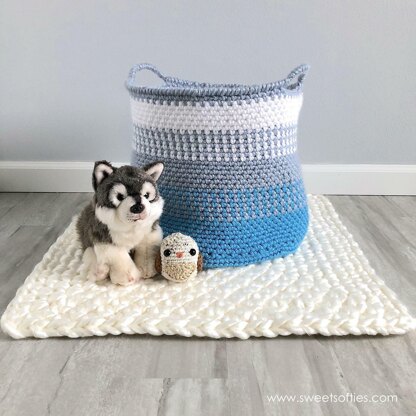The Blue Coast Basket is a simple yet classic nautical design that makes a great home décor piece. Made with super bulky yarn, this oversized container with two handles is functional and perfect for storage and organization in a bedroom, closet, nursery, kid’s room, playroom, or any living space.