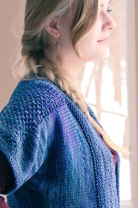 Worked sideways in one flat piece from right to left sleeve cuff, Blue Honey is a long, open front cardigan with honeycomb stitch detail at the shoulders and yoke, and a wide garter band finishing the collar and front edges. With just two sideseams, it’s a sweater that is simple to knit and easy to wear, with long, lean lines and pretty textural details.
