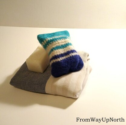 This felted soap saver is one of the best projects for trying out felting. Great for saving your little end pieces of soap or using it for a brand new bar of soap. Its fun to see you project transform when heat and agitation are added to the wool fibers. You can either let it felt naturally in the shower with use, or throw it in the washing machine for instant felting… time to start lathering!