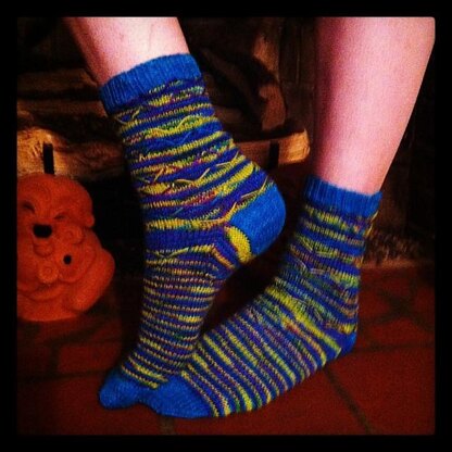 Simple top-down socks, with a simple mountain pattern that displays the beauty of the yarn. 300 yds of the multi-color and 100 yds in the solid contrast color. Reinforced stitching on the heel, back and bottom, to enhance longevity. Comfortable and quick to knit, these socks are great at highlighting pretty hand-dyed yarn, or any other yarn you want to show off.