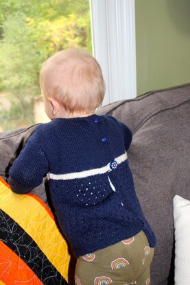 This simple, playful sweater can be worn with the buttons in back (as shown) or in front as a cardigan. The crew neckline is shaped on both front and back for comfort - no matter which way it's worn. A larger button on the contrast band adds to the design and fun. A great way to use some of the one of a kind buttons we all accumulate.