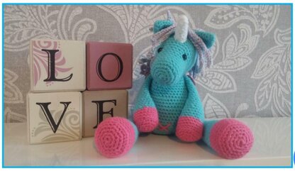 A simple but cute unicorn pattern. Simple instructions accompanied by photographs to help you every step of the way. Made with DK yarn 'Blue' measures approximately 22cm in her seated position.